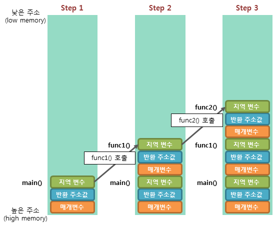 함수는 자신이 동작하는 스레드의 Stack에 매개 변수, 동작을 쌓아 실행된다.