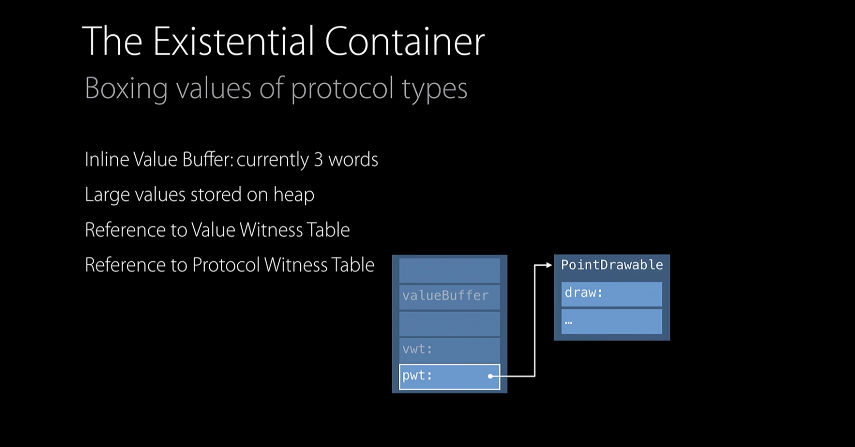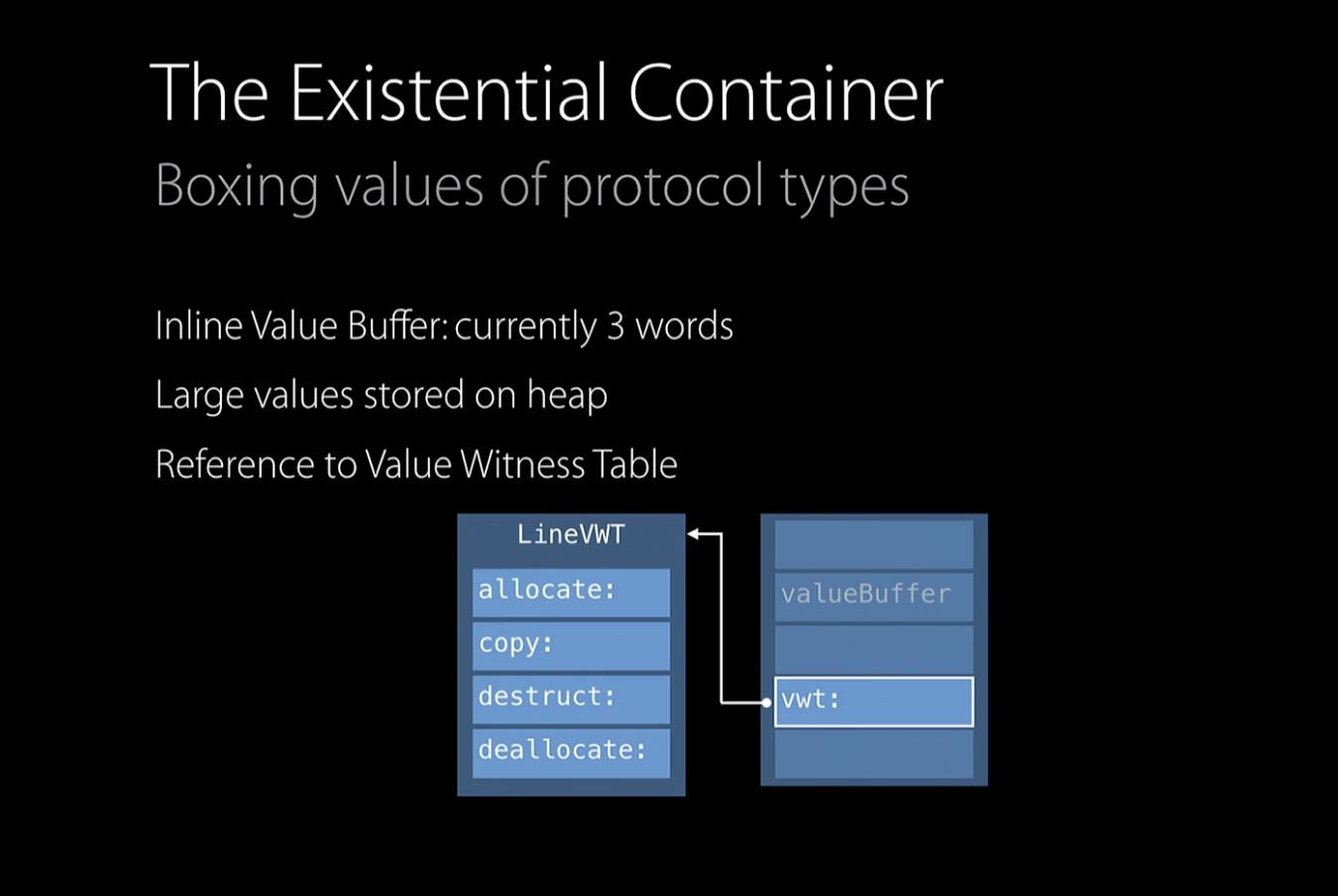 이 컨테이너가 어떤 프로토콜을 위해 만들어졌는지, 그 프로토콜의 요구사항을 어떻게 이행하는지에 대한 정보가 담긴 Witness Table을 가리키는 포인터