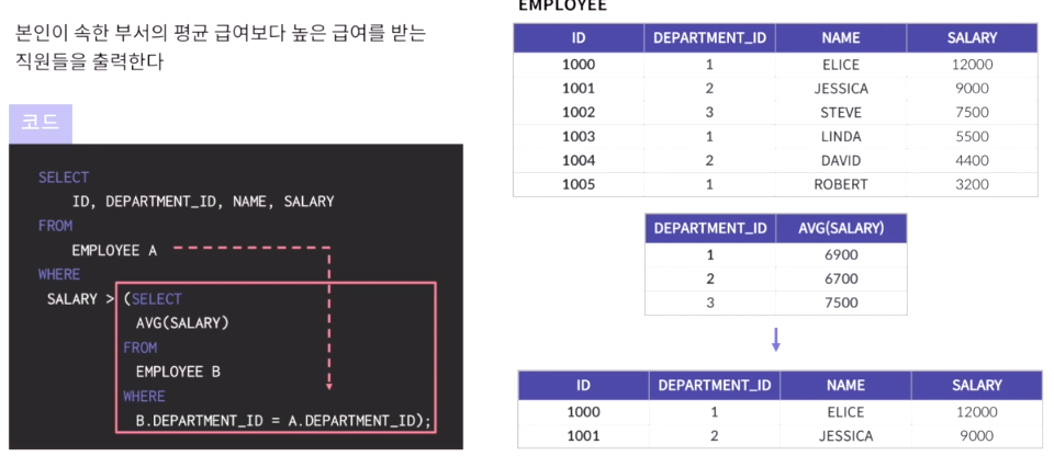 - 연관 서브쿼리와 비연관 서브쿼리로 나눌 수 있음