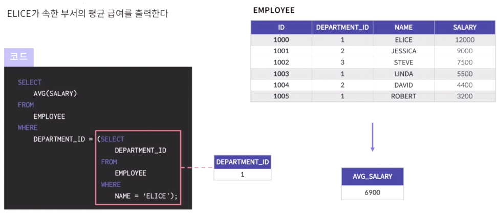 - 서브쿼리의 결과가 한 개의 행을 반환하며, 단일 행 비교 연산자(=,<,>,<=,>=)와 같이 사용된다