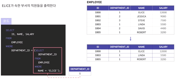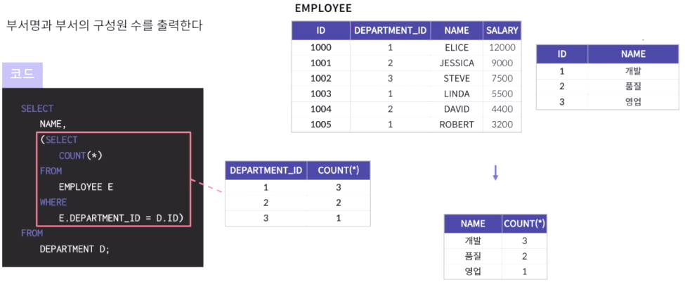 - 두 개 이상의 테이블에서 조인을 사용하지 않고 연관된 데이터를 조회하는 방법 중 하나
