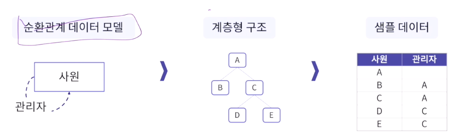 - 동일 테이블에 계층적으로 상위와 하위 데이터가 포함되어 있는 데이터