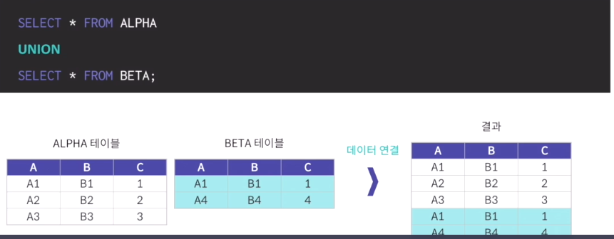 - UNION에 사용할 컬럼의 수와 데이터 형식이 일치해야 하며 합친 후에 테이블에서 중복된 데이터는 제거. 이를 위해 UNION은 테이블을 합칠 때 정렬 과정을 발생시킴