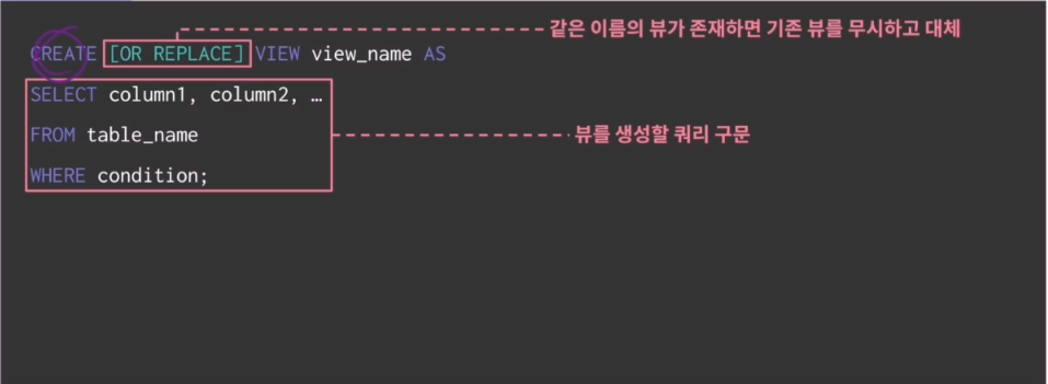 - 뷰의 정의는 변경할 수 없으며, 삭제 후 재생성이 필요하다.