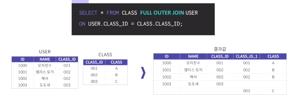 - LEFT OUTER JOIN과 RIGHT OUTER JOIN의 결과를 UNION으로 합치면 FULL OUTER JOIN과 같은 결과를 출력할 수 있다.
