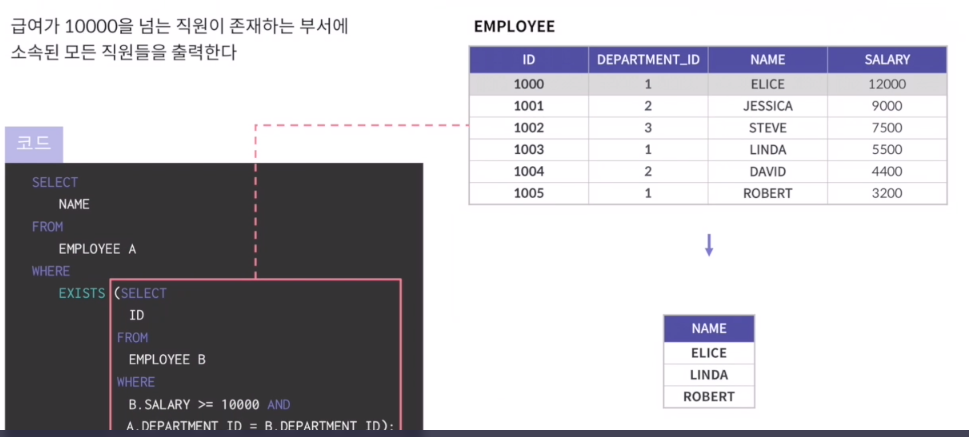 - 서브쿼리의 결과가 두 개 이상 행을 반환할 수 있으며, 다중 행 비교 연산자(in, any, all, exists)와 같이 사용된다