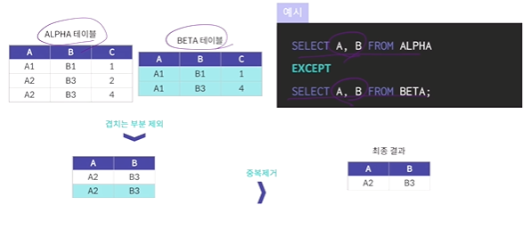 - 두 개의 테이블에서 겹치는 부분을 앞의 테이블에서 제외하여 추출하는 연산