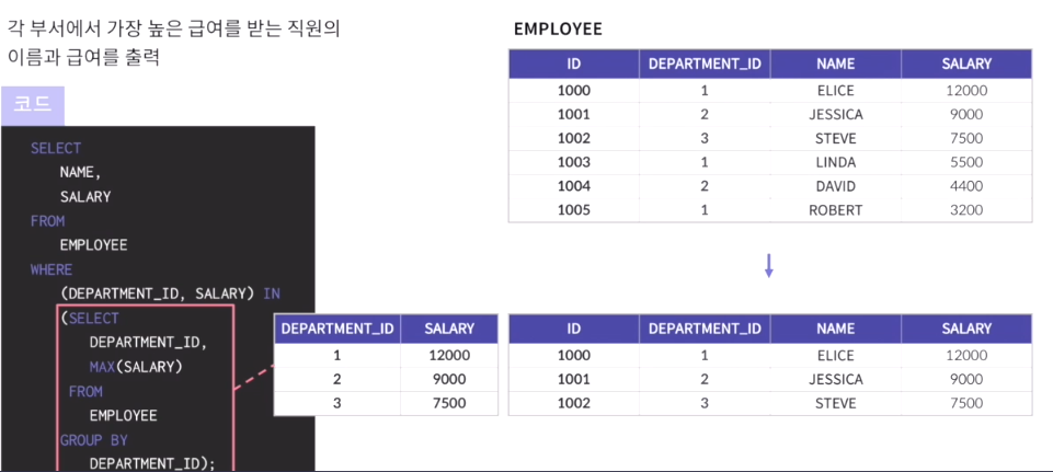 - 서브쿼리의 결과가 여러 개의 컬럼을 반환하며, 메인쿼리의 조건과 동시에 비교된다