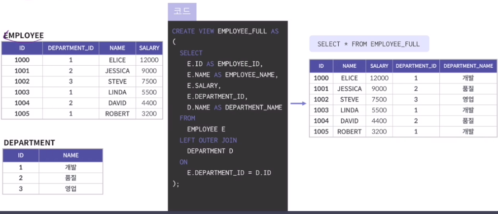 | 독립성 | 테이블 구조가 변경되어도 뷰를 사용하고 있는 응용 프로그램은 변경하지 않아도 된다 |
