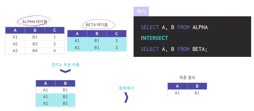 - Oracle/Maria DB에서는 intersect 키워드가 지원되지만 MySQL에서는 지원x(mysql에선s join 등을 활용해야함)