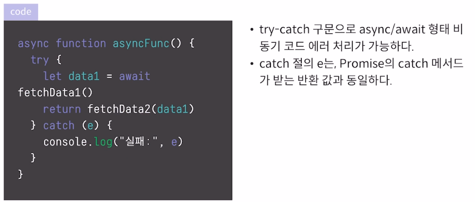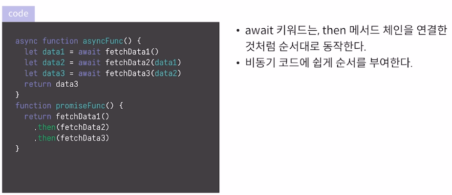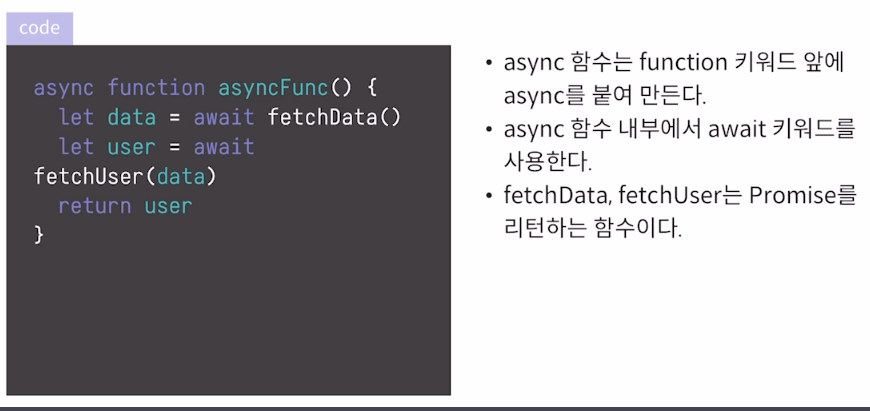 - Promise를 활용한 비동기 코드를 간결하게 작성하는 문법.
