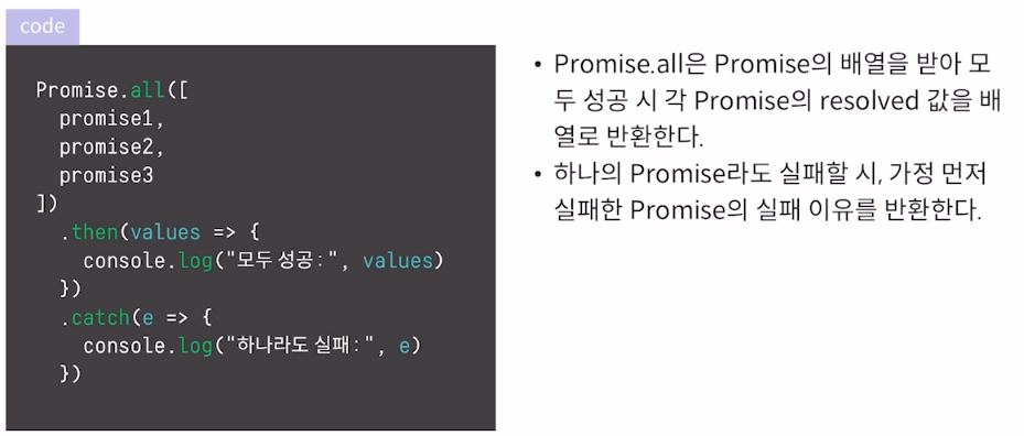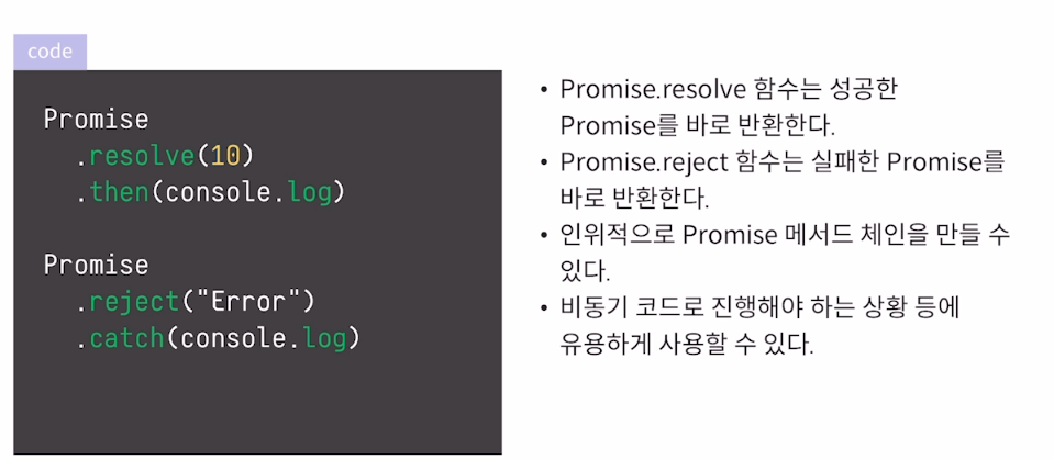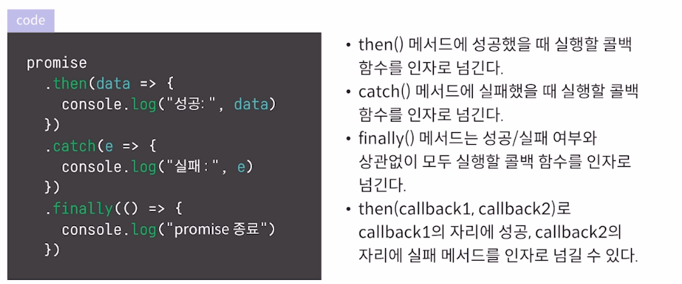 - 대신, 비동기 코드는 정해진 함수를 제공하여 활용할 수 있다.