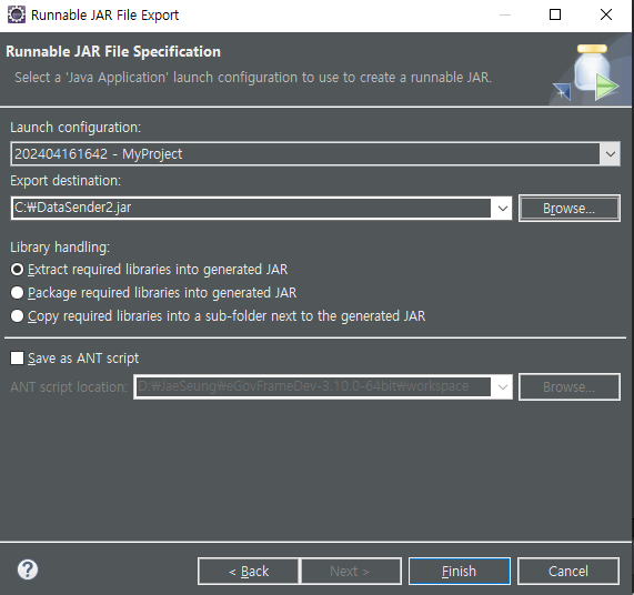 아까 configuration 했던 거 선택해주고 저장위치하고 finish 누르면