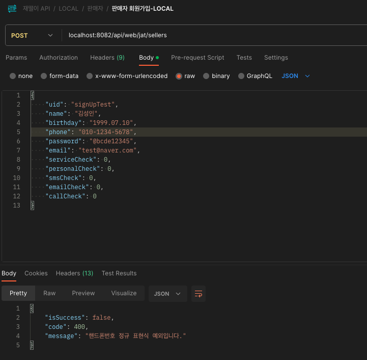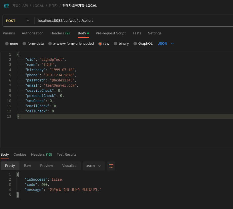 BAD_REQUEST 예외를 발생시킨다.INVALID_UID_FORMAT, INVALID_PW_FORMAT, INVALID_BIRTH_FORMAT, INVALID_PHONE_NUM_FORMAT).ID_ALREADY_EXISTS 예외를 발생시킵니다.PASSWORD_ENCRYPTION_FAILURE 예외를 발생시킵니다.@RestControllerAdvice