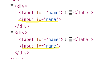이렇게 이름이 들어가는 input과 label에 id뒤에 name이 들어가게 하고