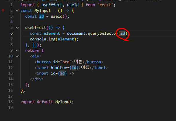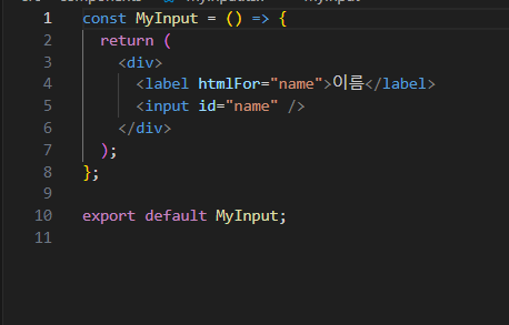 그리고 label에 htmlFor라는 속성을 하나 넣어주고, input의 id를 그대로 넣어준다.