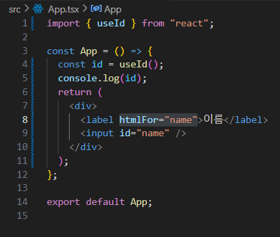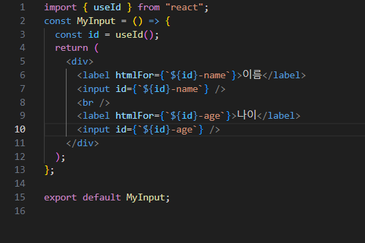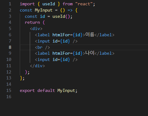 useId를 각각의 인풋에 id와 htmlFor속성에 넣어주겠다.