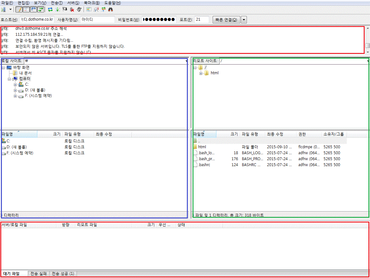 사용자명, 비밀번호: 호스팅 신청 시 입력했던 FTP 아이디와 비밀번호를 입력한다.