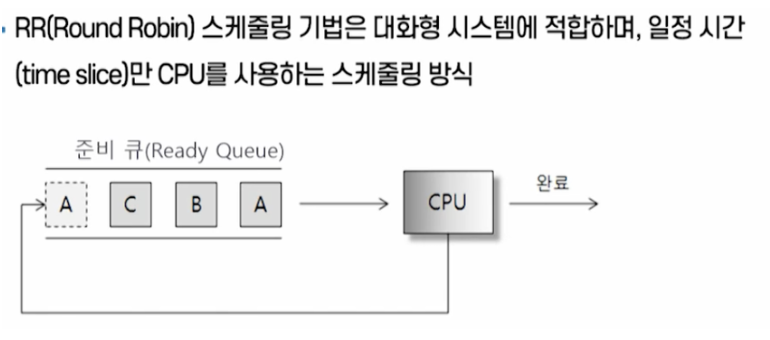 - RR(Round Robin) 스케줄링: 대화형 시스템에 적합, 일정 시간(time slice)만 CPU를 사용하는 스케줄링 방식