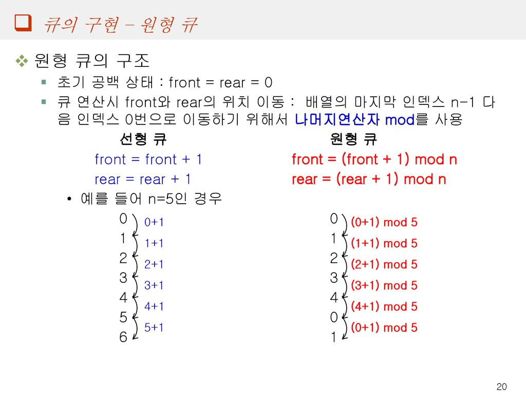 - front = (front + 1) % MAX_SIZE: 원소를 제거할 때 front를 다음 위치로 이동. 만약 front가 MAX_SIZE - 1에 도달하면, 다음 위치는 0