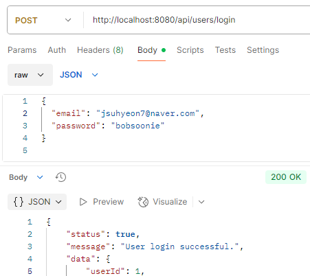 가입한 정보를 통해 로그인을 진행하였다. 로그인을 하면 accessToken과 refreshToken을 받게 되는데 이 토큰이 필요한 이유는 인증된 사용자만이 어플 내의 API를 사용할 수 있기 때문이다.