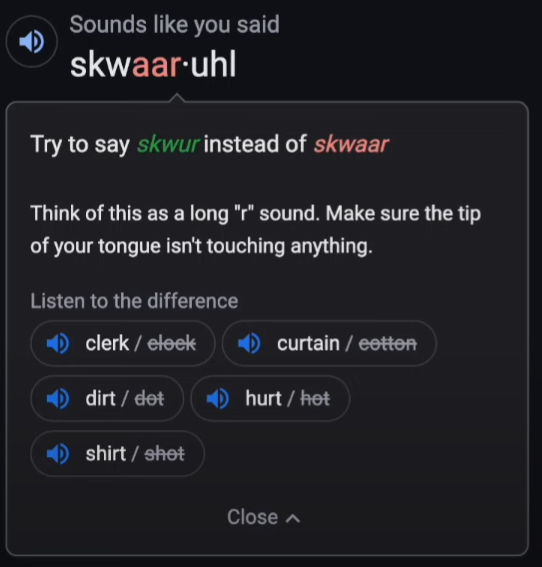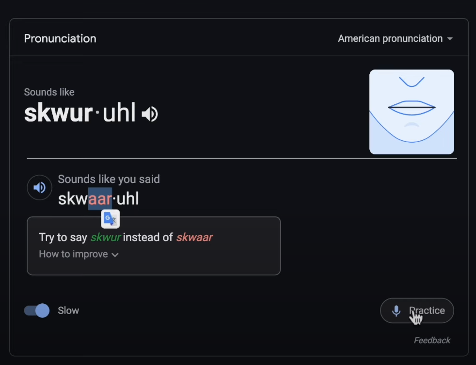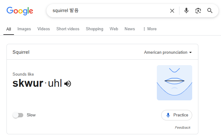 구글에 원하는 단어의 발음을 검색 (예시 : squirrel 발음)