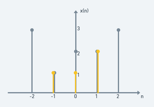 위와 같은 이산 신호 x(n) = [ 3, 1, 2, 2, 3 ]이 있다 하자. 위 그림에서 각 index k에 있는 값들은 dirac delta함수를 사용하여 x(k)×δ(n−k)으로 나타낼 수 있다. 예를 들어 x(1)=x(1)×δ(n−1)로 나타낼 수 있다. 즉