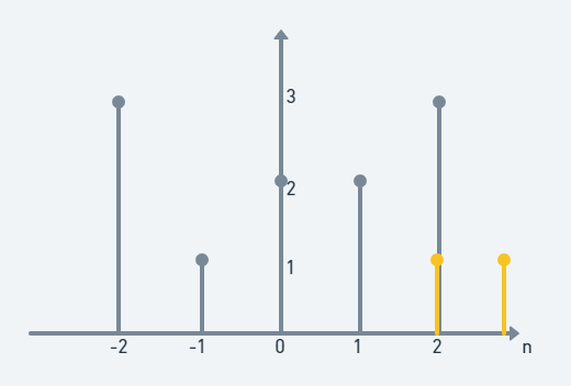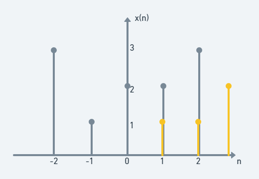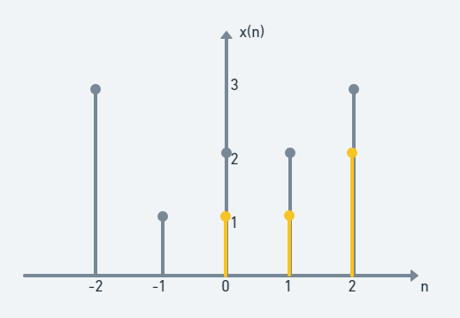 아래와 같은 이산 신호 x(n) = [3, 1, 2, 2, 3]과 y(n) = [2, 1, 1]이 있다 가정하자. 값이 없는 구간은 모두 0이라 하자.