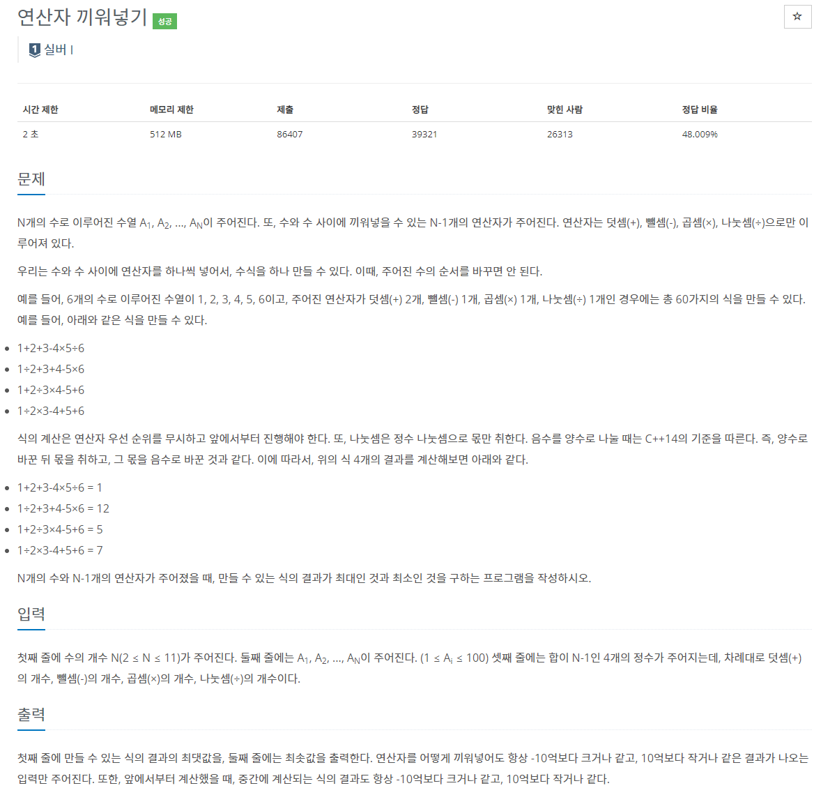 이 문제는 주어진 수열에 주어진 연산자를 적절히 삽입하여 만들 수 있는 최댓값과 최솟값을 구하는 문제