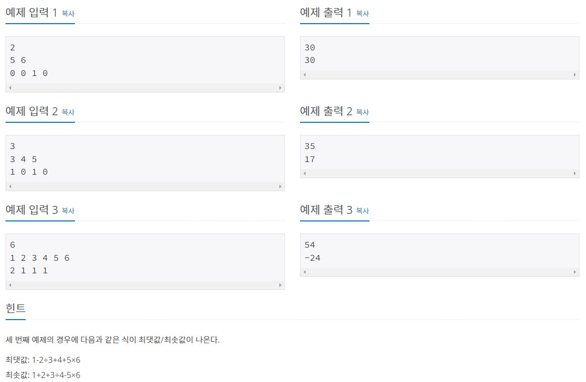 주어진 수열의 숫자와 연산자를 모두 활용하여 가능한 모든 계산식을 생성하고, 계산식의 결과를 최댓값과 최솟값과 비교하여 갱신하는 방식으로 문제를 해결할 수 있다.