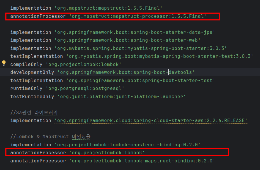 아래와 같이 Entity 나 DTO 에 @Setter없이 Builder를 사용하는 경우 annotationProcessor 순서를 MapStruct -> Lombok 이 되도록 설정한다.
