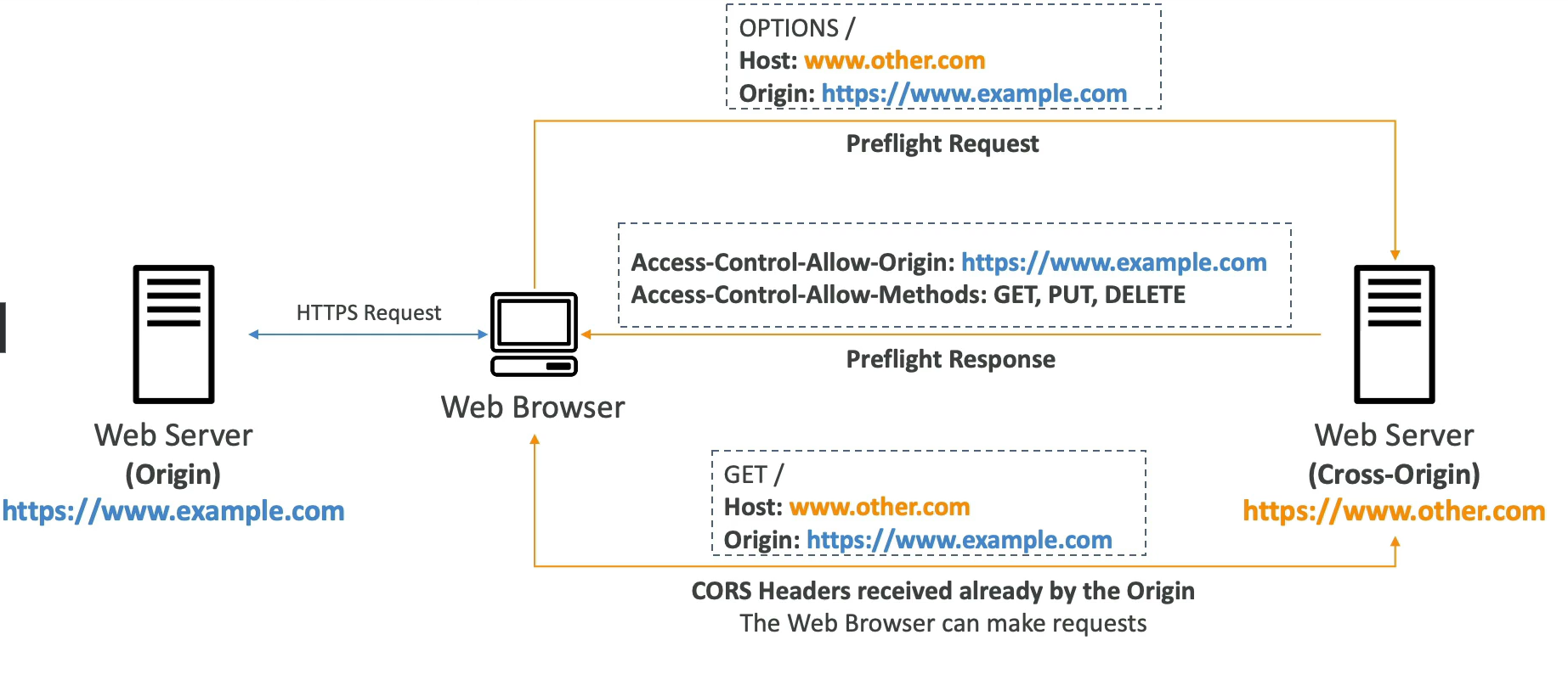 웹 브라우저는 SOP 보안 정책을 기본값으로 두며 CORS 허용 시에만 서로 다른 출처끼리 요청을 주고 받을 수 있다.