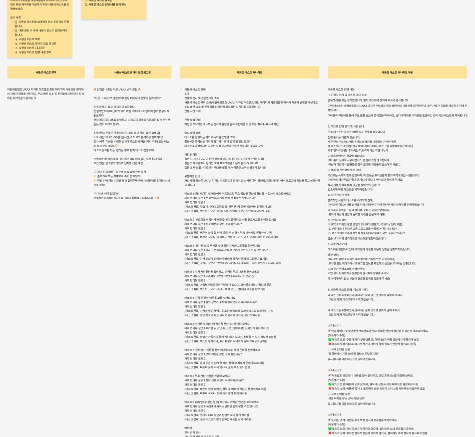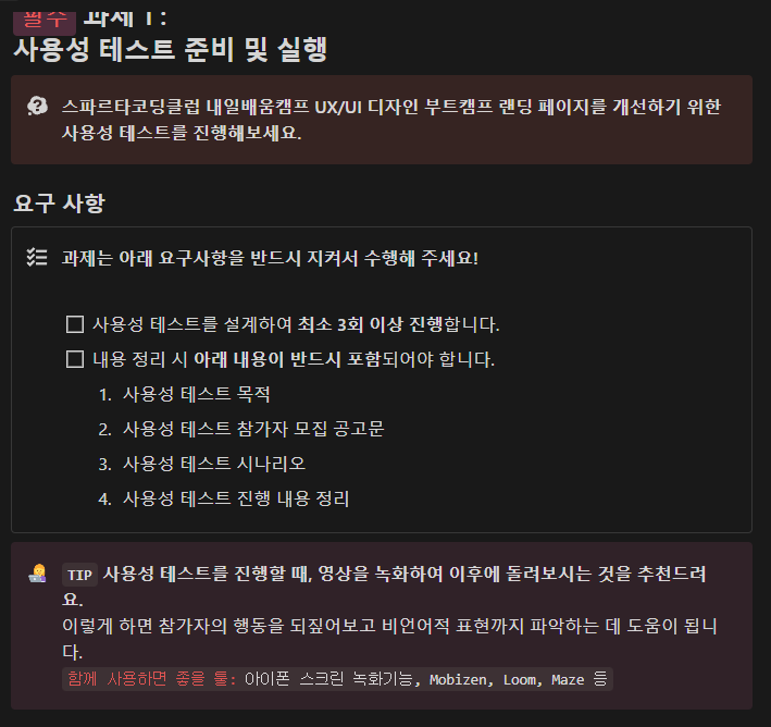 사용성 테스트의 모집 대상과 테스트 개요가 사라진 것은 사용성 테스트를 UXUI 부트캠프 인원 내에서 진행할 계획이며, 개요 또한 동일한 주제의 사용성 테스트를 전원이 진행하므로 개요를 소개할 필요성을 느끼지 못하였음
