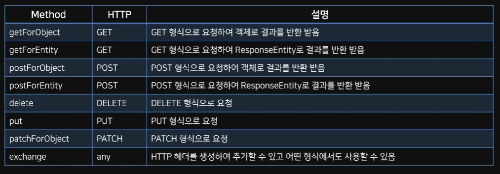 RestTemplate Class는 REST 서비스를 호출하도록 설계되어 HTTP Protocol의 메소드에 맞게 여러 메소드들을 제공한다