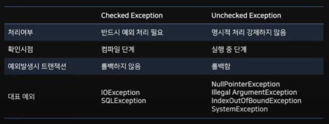 RuntimeException은 Unchecked이며 그 외 Exception은 Checked Exception