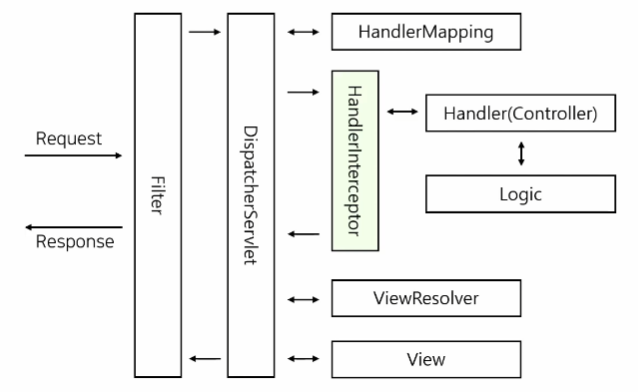 DispatcherServlet과 Controller 사이에서 Request를 가로채는 역할 수행