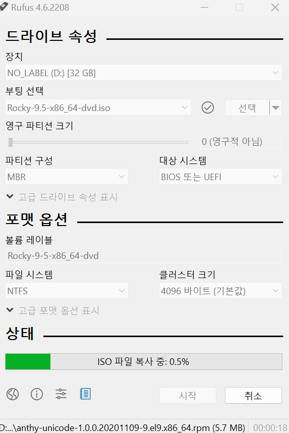 또한 VM이 아니라 물리적으로 USB를 통해 설치를 진행할 것이기 때문에 rufus를 통해 현재 가지고 있는 USB를 Bootable Drive로 만들어준다.