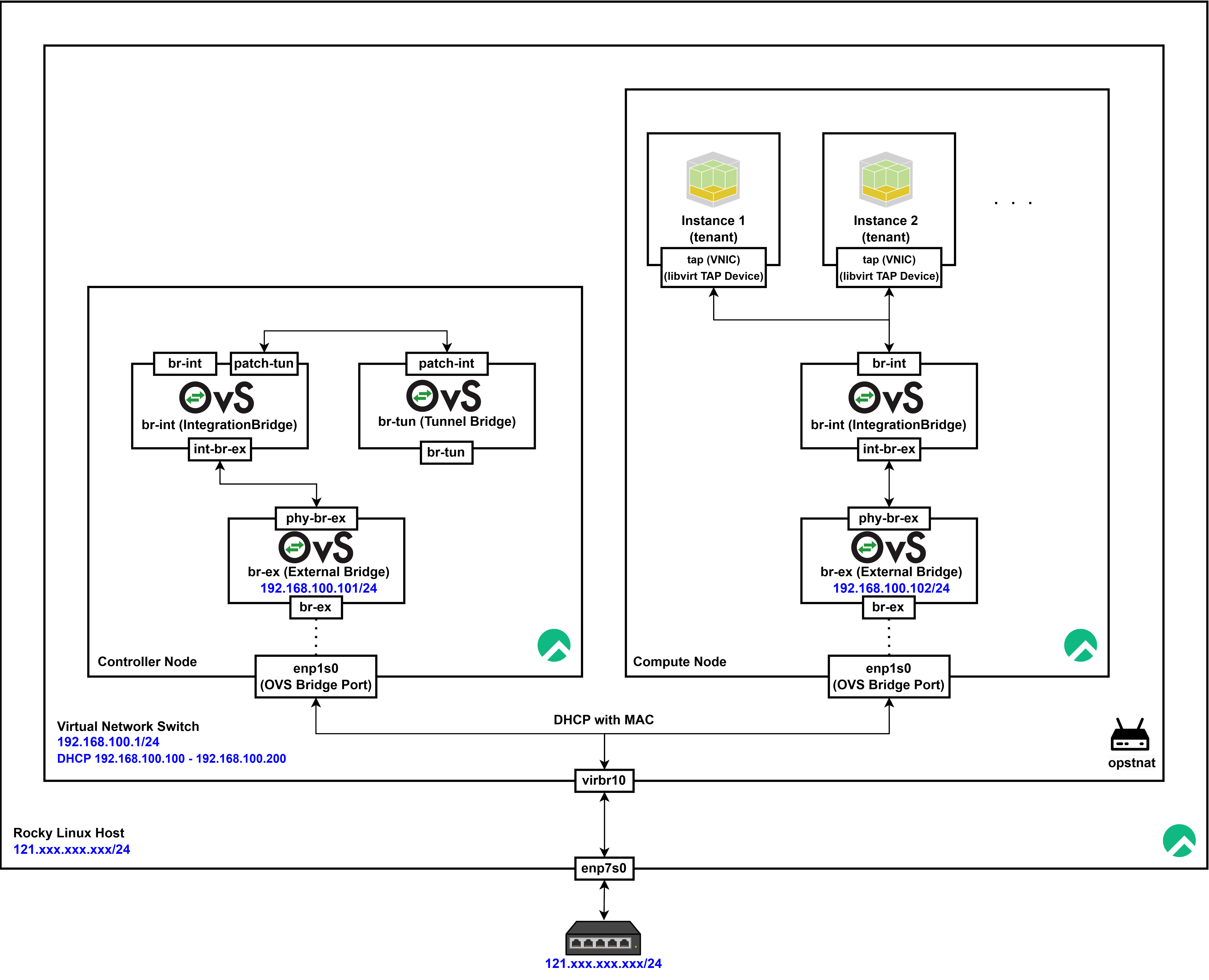 단일 Compute Node 환경에서는 모든 인스턴스들이 br-int를 통해 통신하기 때문에 VXLAN 터널링이 필요하지 않아 현재 VXLAN 때문에 바인딩 실패가 발생하는 것을 확인하고, 터널링을 아예 제거하고 flat + vlan로 구성하여 문제를 해결하고자 하였다.