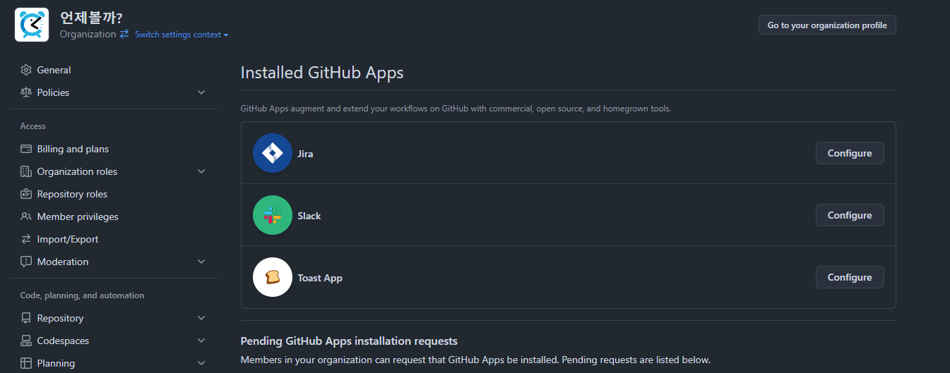 이후 Github Issue와 Branch를 더 쉽게 생성할 수 있도록 하기 위해 위와 같이 Jira와 Github를 연동한다