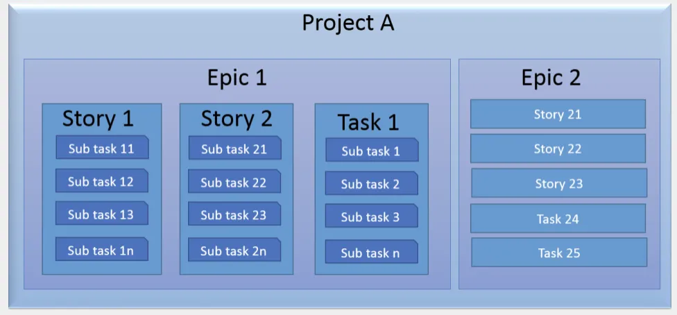 에픽이 가장 큰 단위, 그안에 스토리들과 스토리보다는 작은 단위인 작업 이 존재