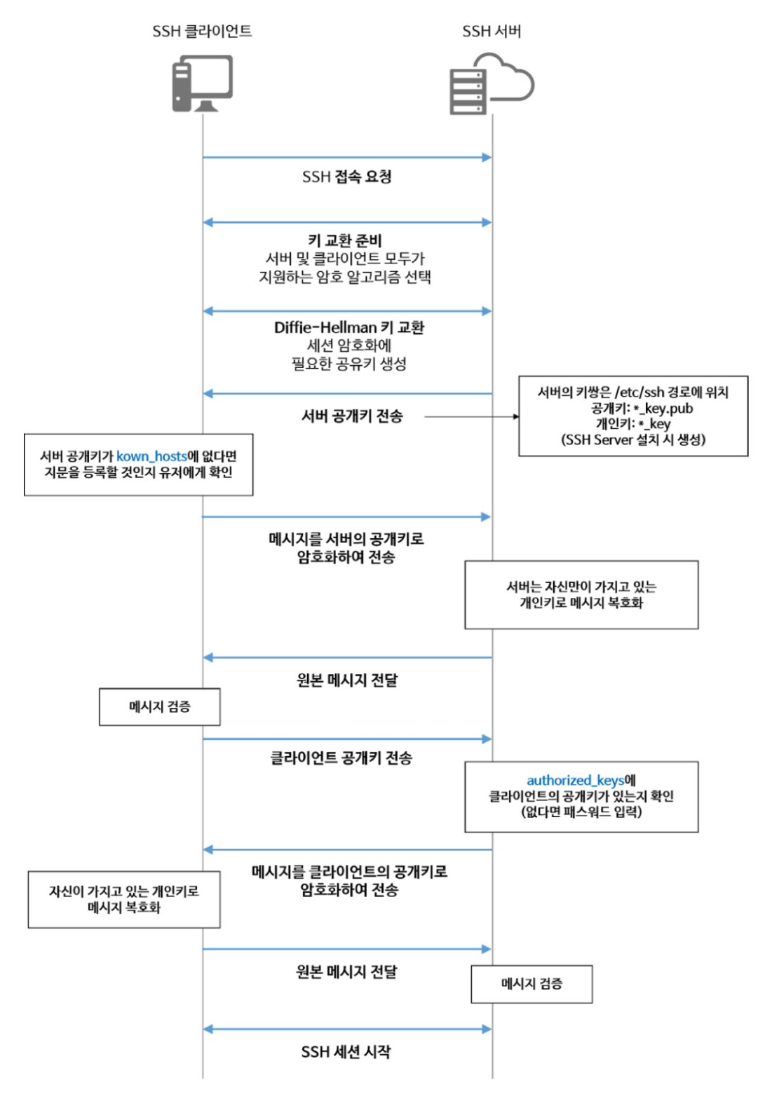 .ssh 디렉토리에는 다음과 같은 파일이 있다. id_rsa : 개인키id_rsa.pub : 공개키authorized_keys : 해당 파일에 로그인할 클라이언트의 공개키가 기록되어 있어야 한다. 공개키를 복사하는 명령어 ssh-copy-id를 사용한다.