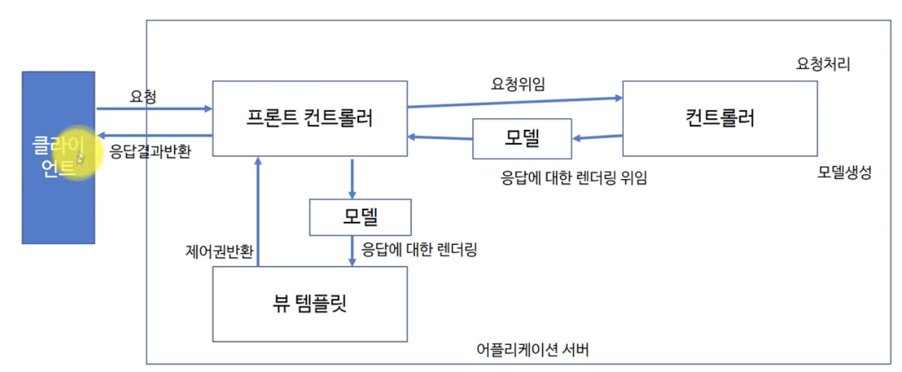 프론트 컨트롤러는 요청만 받고 처리는 하지 않는다. 모든 요청은 처리는 컨트롤러 또는 Handler에 보낸다. 이러한 Controller는 Bean으로 결과를 만들어 Model에 보내고, 프론트 컨트롤러가 응답을 반환한다.
