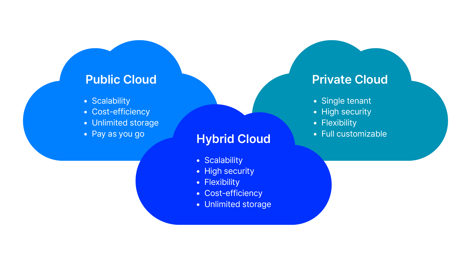 크게 프라이빗 클라우드, 퍼블릭 클라우드, 하이브리드 클라우드, 멀티 클라우드로 나눌 수 있다.