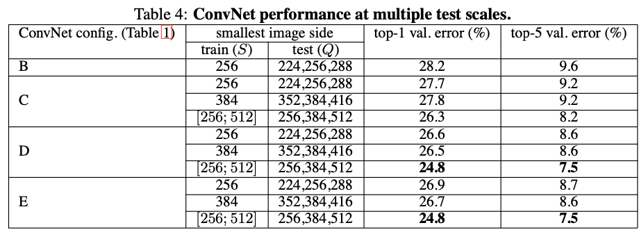 VGG에서는 입력 이미지의 크기(S)를 달리 해 학습한 후 성능 차이를 비교했습니다.