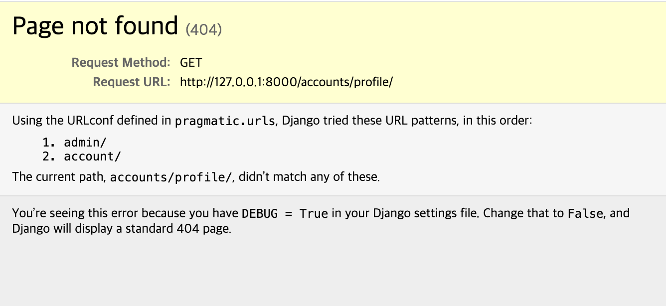 문제가 되는 이유는, 헤더의 login 버튼을 눌러서 로그인 페이지로 접근한 것이 아니기 때문에 next 인자를 전달하지 않고, LOGIN_REDIRECT_URL도 따로 설정된 것이 없으므로 Default(=/profile) 경로로 redirect 되기 때문이다.