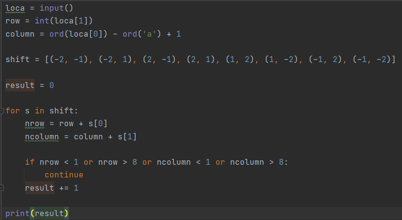 상하좌우 문제와 크게 다르지 않다. 단지 한번 이동할 때의 범위만 수정되었다. 이 후 알고리즘은 상하좌우와 같다. 열 값을 아스키코드를 활용하여 숫자로 변환한다.