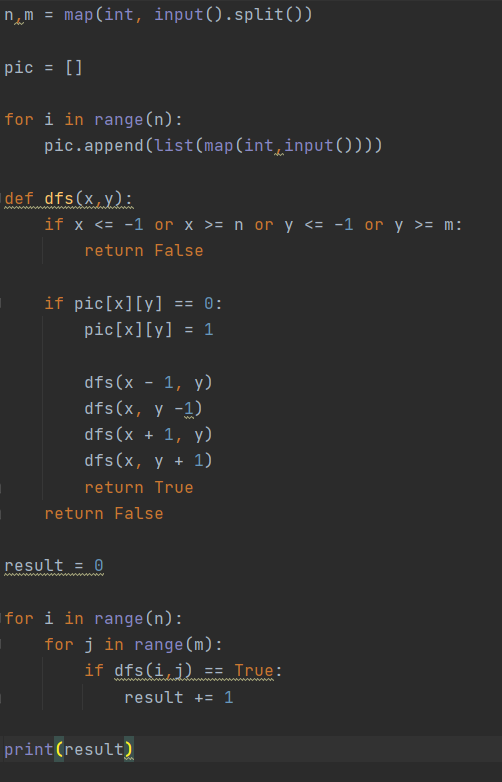위 문제는 0으로 이루어진 공간의 개수를 출력하는 문제이다. DFS를 이용하여 0이 있는 공간을 상하좌우 모두 체크하고 공간이 없으면 개수를 1씩 늘려가며 결과값을 출력하도록 한다.