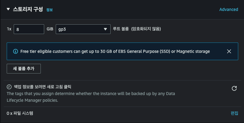 마지막으로 스토리지 구성은 프리티어에서는 30GB 무료라고 하네요. 30GB 입력하고 하단 인스턴스 시작을 눌러줍니다.