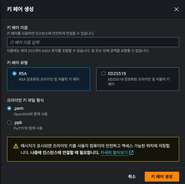 키 페어 이름 입력 후 유형에서 RSA 암호화 알고리즘 선택(비대칭키)
