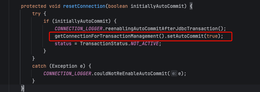 그런데, 여기서 doConnectionsFromProviderHaveAutoCommitDisabled이 true가 아니면, Auto commit 여부를 체크하기 위해서 getConnectionForTransactionManagement()이 실행되는데, 이 때 @Trnasactional에 정의한 설정이 읽히지 않고 기본 설정으로 커넥션을 세팅하게 된다.